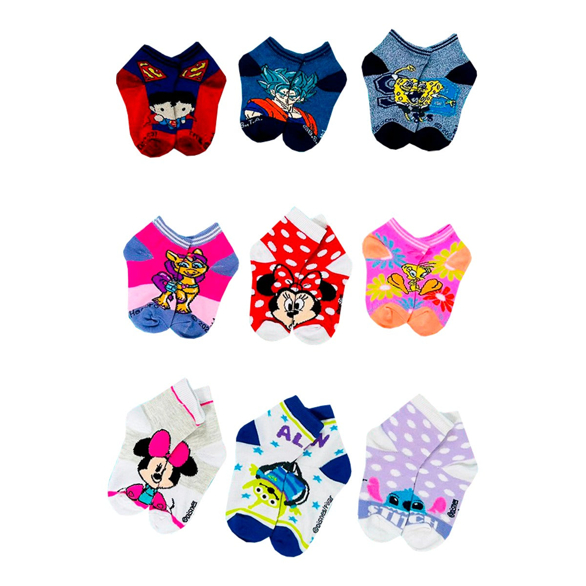 Nuestro CALCEPACK Disney infantil, incluye 12 pares de tines muy a la moda y divertidos de tus personajes favoritos.