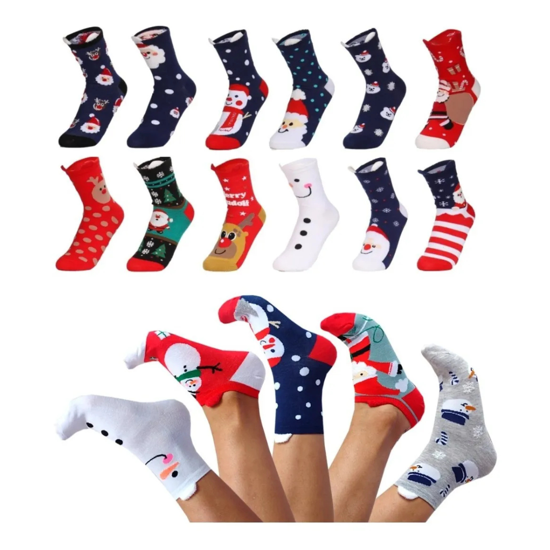 Este set de 12 pares de calcetas navideñas para mujer está elaborado en algodón suave y presenta diseños con personajes navideños y orejitas, combinando estilos cortos, largos y mixtos. Perfectas para brindar calidez y un toque festivo durante la temporada, ofrecen comodidad y variedad para diferentes preferencias y ocasiones.