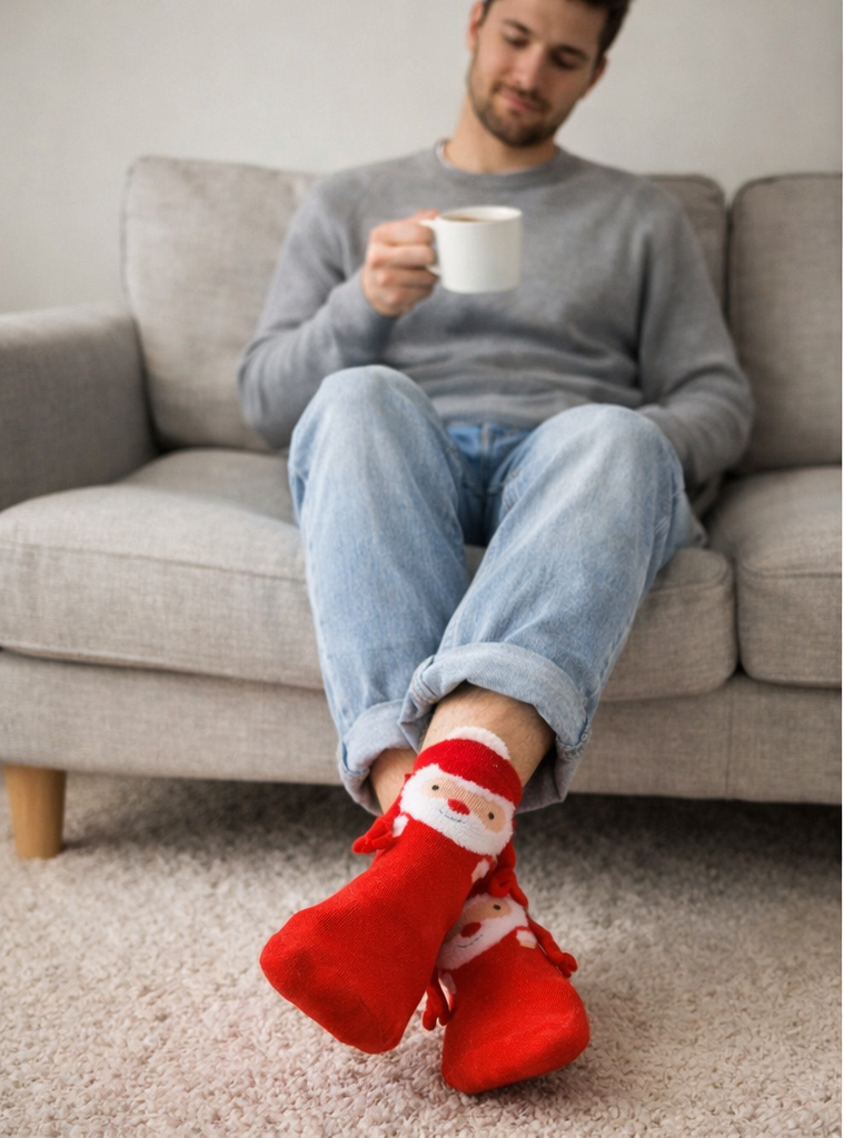 Estas calcetas navideñas con un modelo de manitas y detalle de imán combinan estilo y funcionalidad para complementar tus atuendos festivos. Su material cómodo y cálido asegura confort durante toda la temporada, mientras que el imán añade un toque distintivo y práctico para mantenerlas en su lugar. Perfectas para quienes buscan un accesorio navideño único y de calidad.