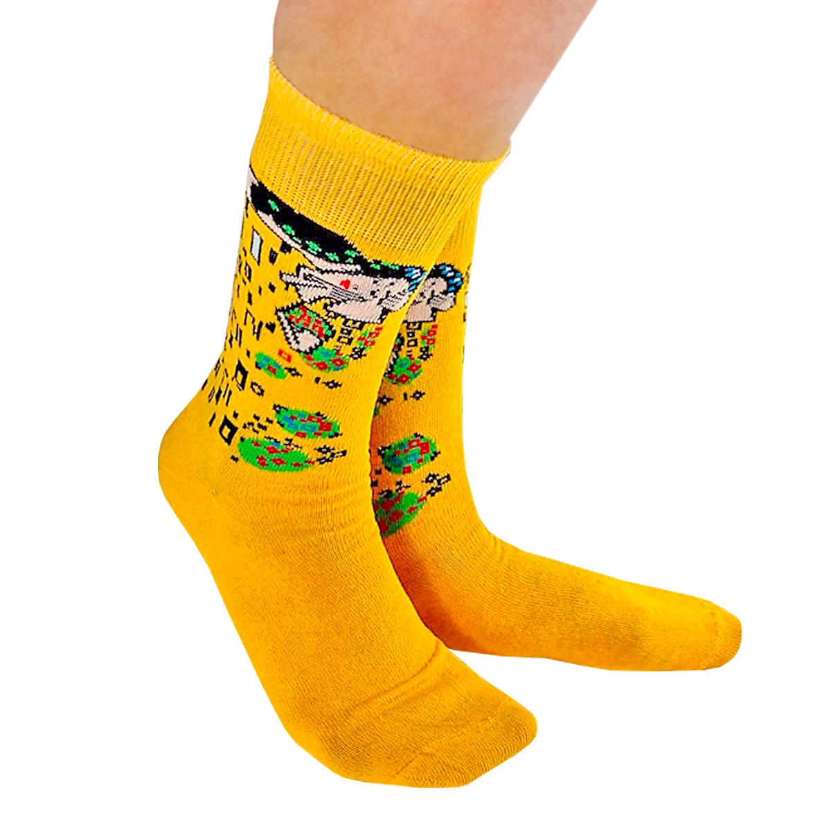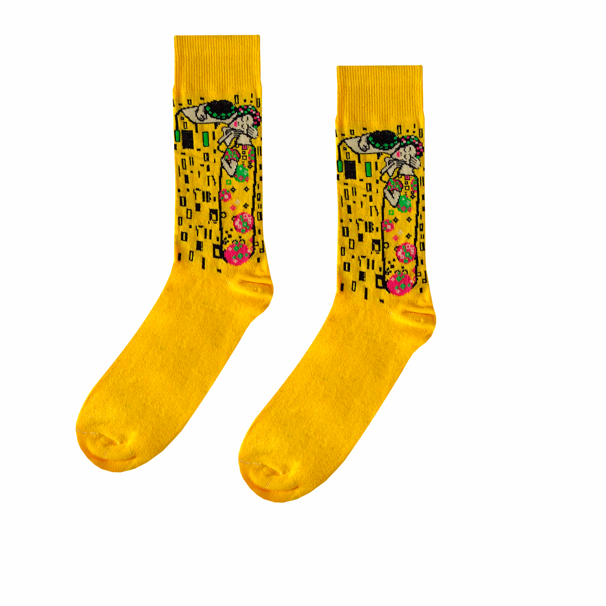Los calcetines "El Beso" son una obra de arte para tus pies. Con su diseño de besos, destacarás en cualquier ocasión y expresarás tu amor por el arte. Hechos con materiales de alta calidad, estos calcetines son cómodos y duraderos. Perfectos para mostrar tu estilo y personalidad. ¡Haz una declaración con cada paso!.