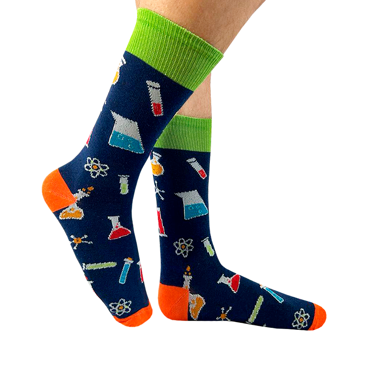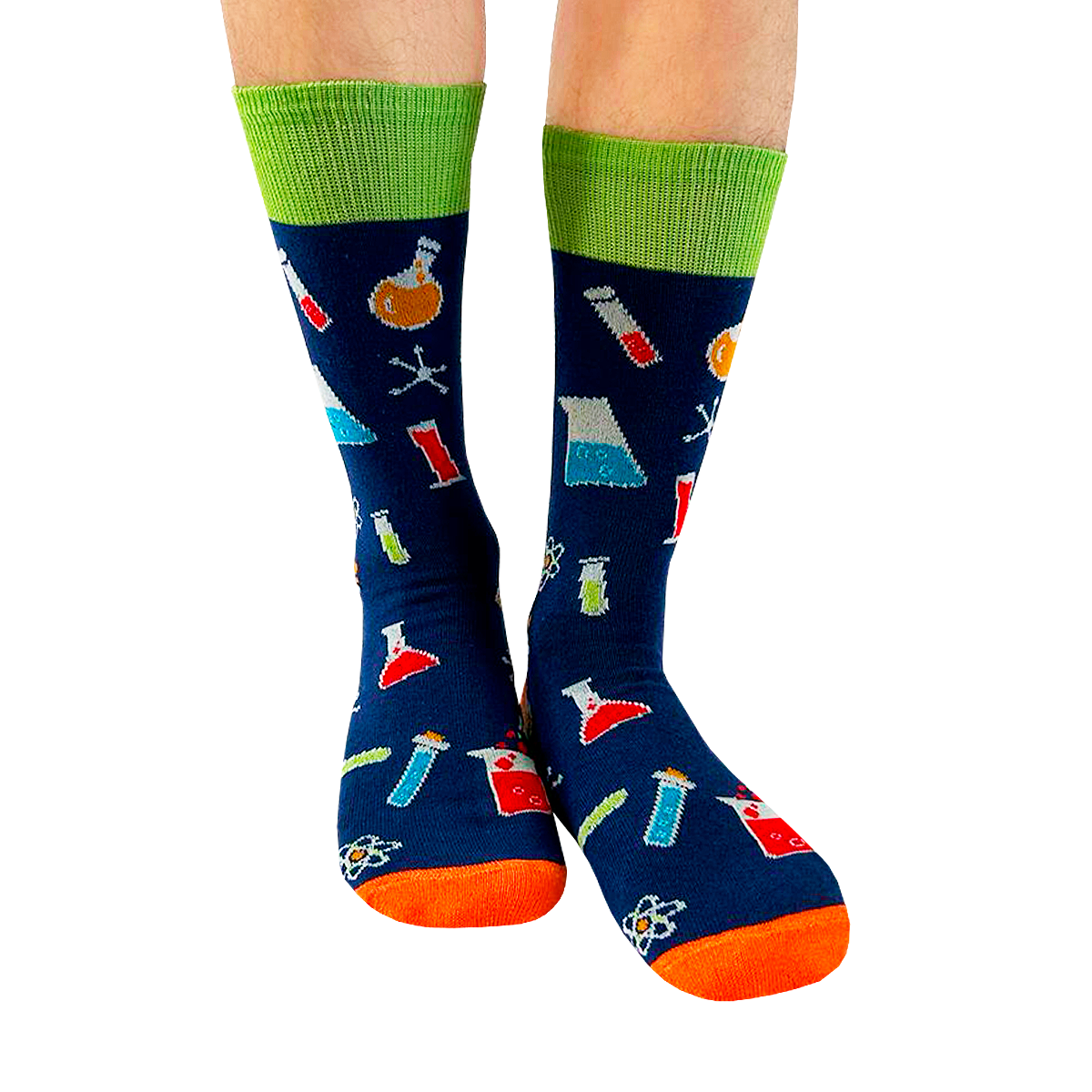 Calcetines "Química": Experimenta la comodidad y el estilo con nuestros calcetines de química. Fabricados con materiales de alta calidad, estos calcetines te mantendrán cómodo durante todo el día mientras muestras tu pasión por la química. Perfectos para cualquier ocasión, ¡haz una declaración científica con cada paso que des!.