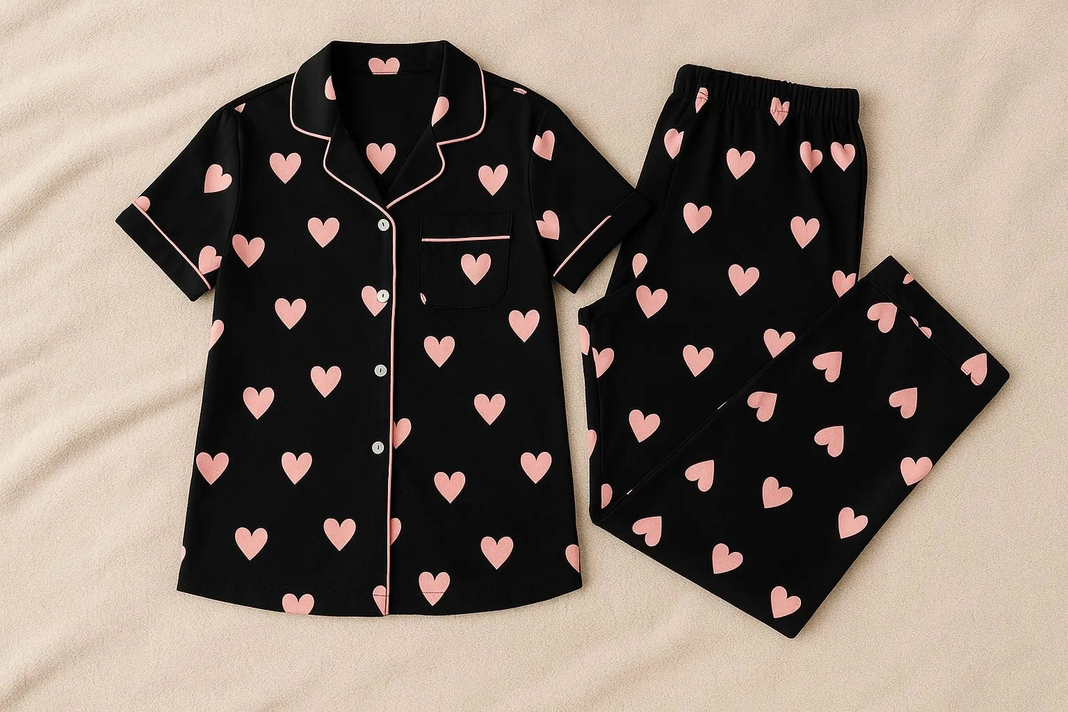 Obtén comodidad y estilo con nuestro conjunto de pijama diseño de corazones. Diseñado con un estampado de corazones, este pijama ofrece un aspecto dulce y femenino. Esta suave y cómoda pijama te hará sentir elegante incluso mientras duermes. La tela suave y elástica te mantendrán cómodo y relajado durante toda la noche. Fabricado con materiales de alta calidad, ligeros y frescos; son ideales para las noches más cálidas.