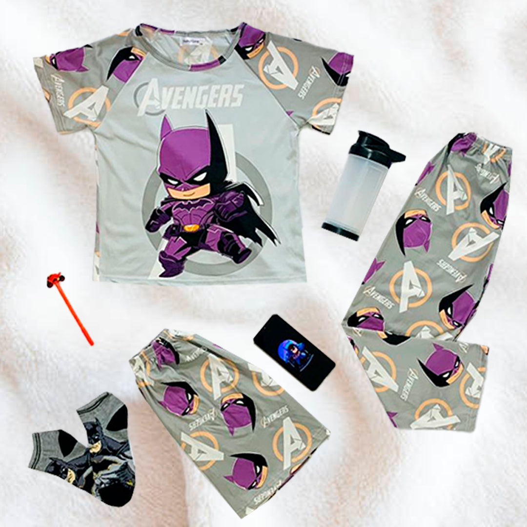 Esta pijama infantil de Batman en color gris incluye tres piezas: playera, pantalón y short. Diseñado para ofrecer comodidad y versatilidad, permite a los niños elegir la opción que mejor se adapte a la temperatura o actividad. Ideal para fans de Batman, combina estilo y funcionalidad en un conjunto práctico para el descanso y el juego.