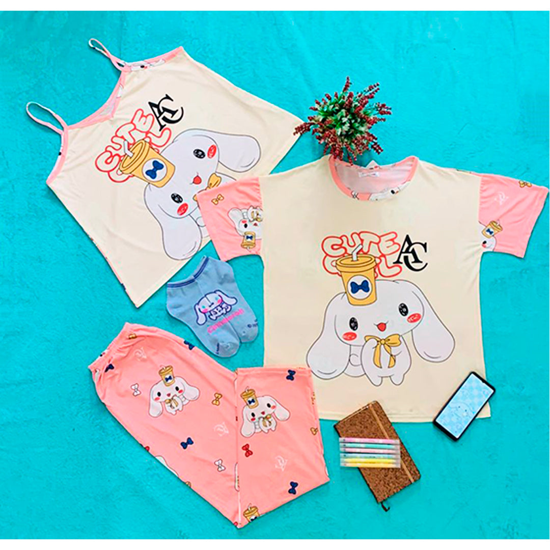 Disfruta de un descanso cómodo y con estilo con esta pijama de "Cinnamoroll Soda", que incluye una playera, blusa y pantalón. Diseñado para ofrecer suavidad y libertad de movimiento, es ideal para tus noches y momentos de relajación. Perfecto para quienes buscan combinar ternura y confort en su ropa de dormir.
