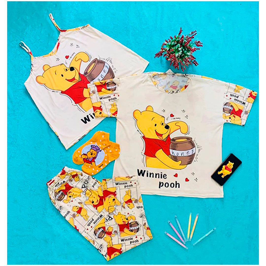 Este conjunto de pijama "Winnie Pooh Honey" incluye una playera, blusa y pantalón, cuidadosamente diseñados para brindar comodidad y estilo. Con materiales suaves y un ajuste pensado para el descanso, este pijama es ideal para quienes buscan un conjunto completo que combine funcionalidad y el encanto del icónico personaje Winnie Pooh. Perfecto para disfrutar de noches tranquilas con un toque de ternura y confort.