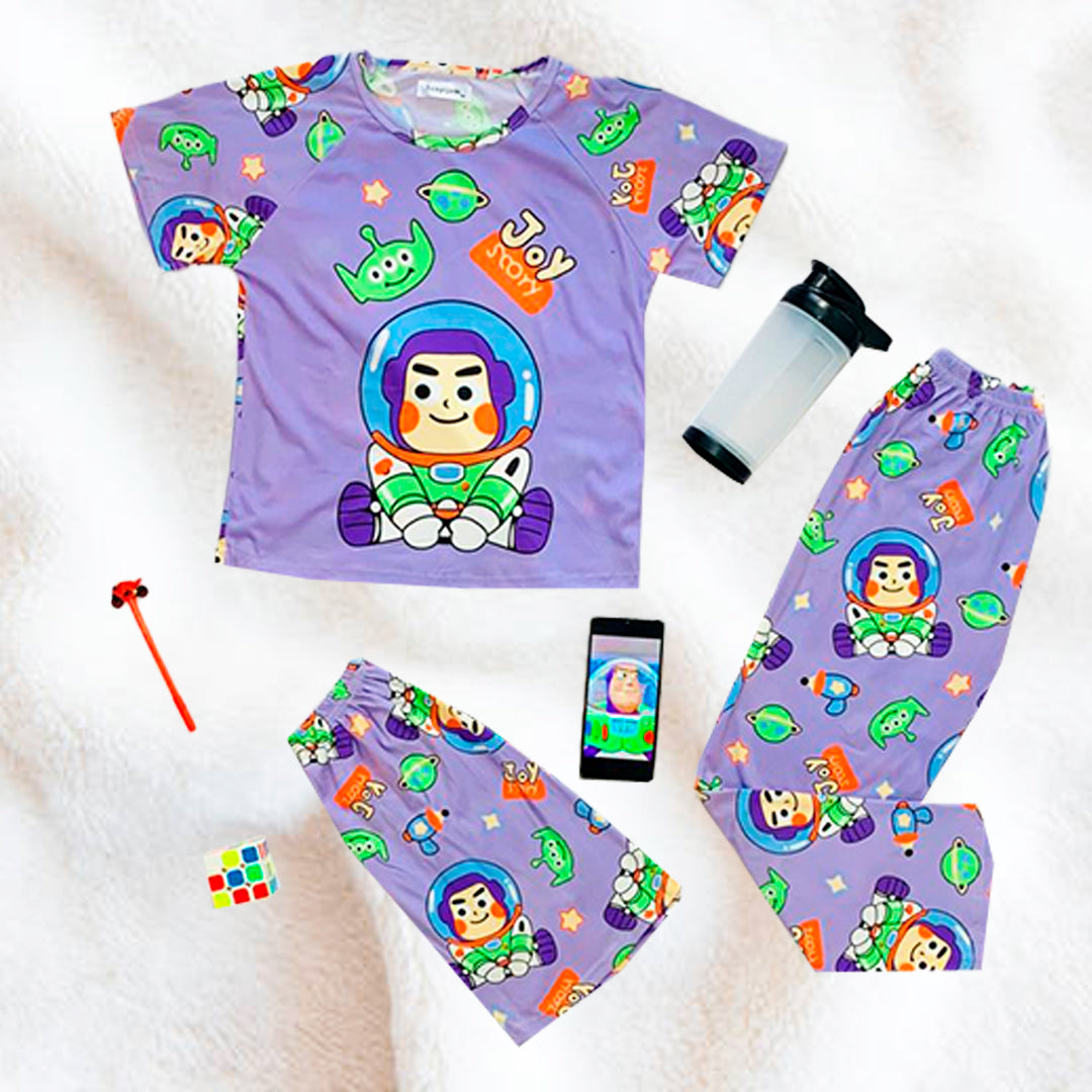 Este pijama infantil de Buzz Lightyear en color morado incluye tres piezas: playera, pantalón y short. Diseñado para ofrecer comodidad y versatilidad, permite a los niños elegir entre pantalón largo o short según la temperatura. Ideal para los pequeños fans de Buzz Lightyear que buscan un conjunto práctico y con estilo.